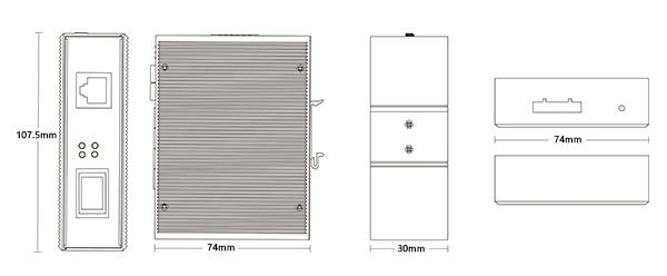 机械属性 | 外壳:金属材质 安装:DIN 卡轨式,壁挂式安装 重量:0.36Kg 尺寸:107.5 x 74 x 30mm(长 x 宽 x 高) |