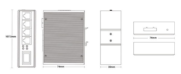 机械属性 | 外壳:全铝合金材质 安装:DIN 卡轨式,壁挂式安装 重量:0.36Kg 尺寸:107.5 x 74 x 30mm(长 x 宽 x 高) |