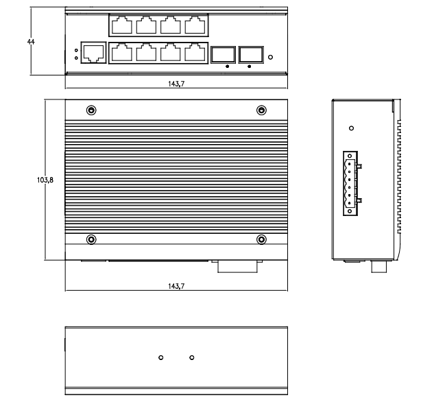 交换机属性 | 外壳:IP40防护等级,金属外壳 安装 :DIN 卡轨式,壁挂式安装 散热方式:自然冷却,无风扇 重量 :0.64Kg 尺寸 :143.7 x 103.8 x 44mm (长 x 宽 x 高) |